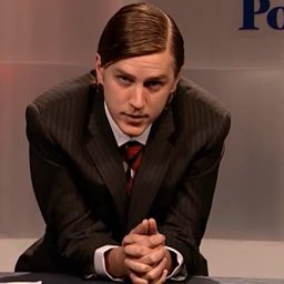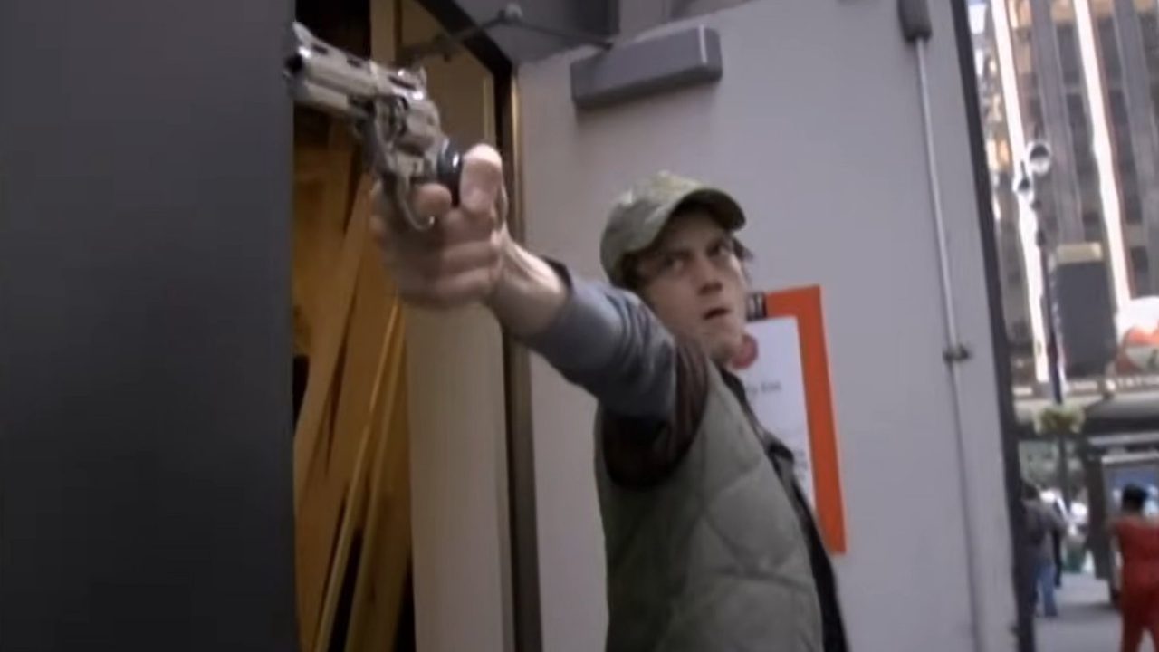 Jerry Bronham (Trevor Moore) defends extreme weapons like “baby skull-seeking bullets” with comical counterpoints until his arguments suddenly play out in grim reality