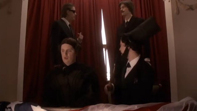 Abraham Lincoln (Zach Cregger) tries to enjoy a play with Mary Todd Lincoln (Timmy Williams), but their casual, anachronistic conversation—full of Diet Cokes, dinner plans, and British invasion rumors—is repeatedly interrupted by John Wilkes Booth (Trevor Moore), who bursts in shouting “Sic semper tyrannis” and throws objects like a phone book and an orange at the president. A baffled, modern-day security guard (Darren Trumeter) with a Boston accent struggles to maintain order as the intrusions escalate. The sketch plays with historical absurdity by portraying the lead-up to Lincoln’s assassination as a low-stakes domestic comedy, where bad reenactment, modern attitudes, and escalating nonsense turn a national tragedy into pure farce.